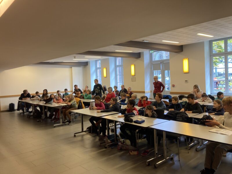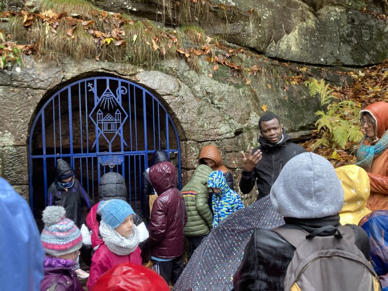 A l’abri des intempéries et au chaud, Père Amoce retrace aux enfants la vie de Sainte Odile et la création du lieu.
